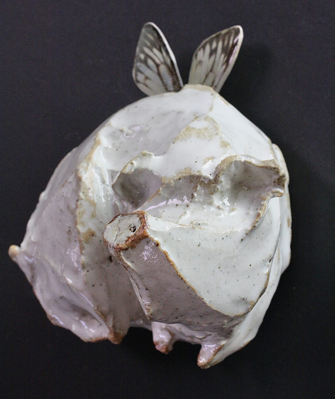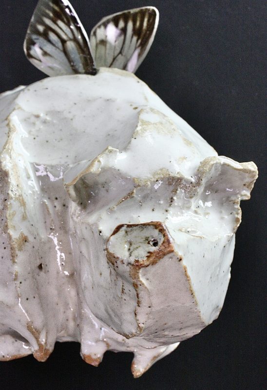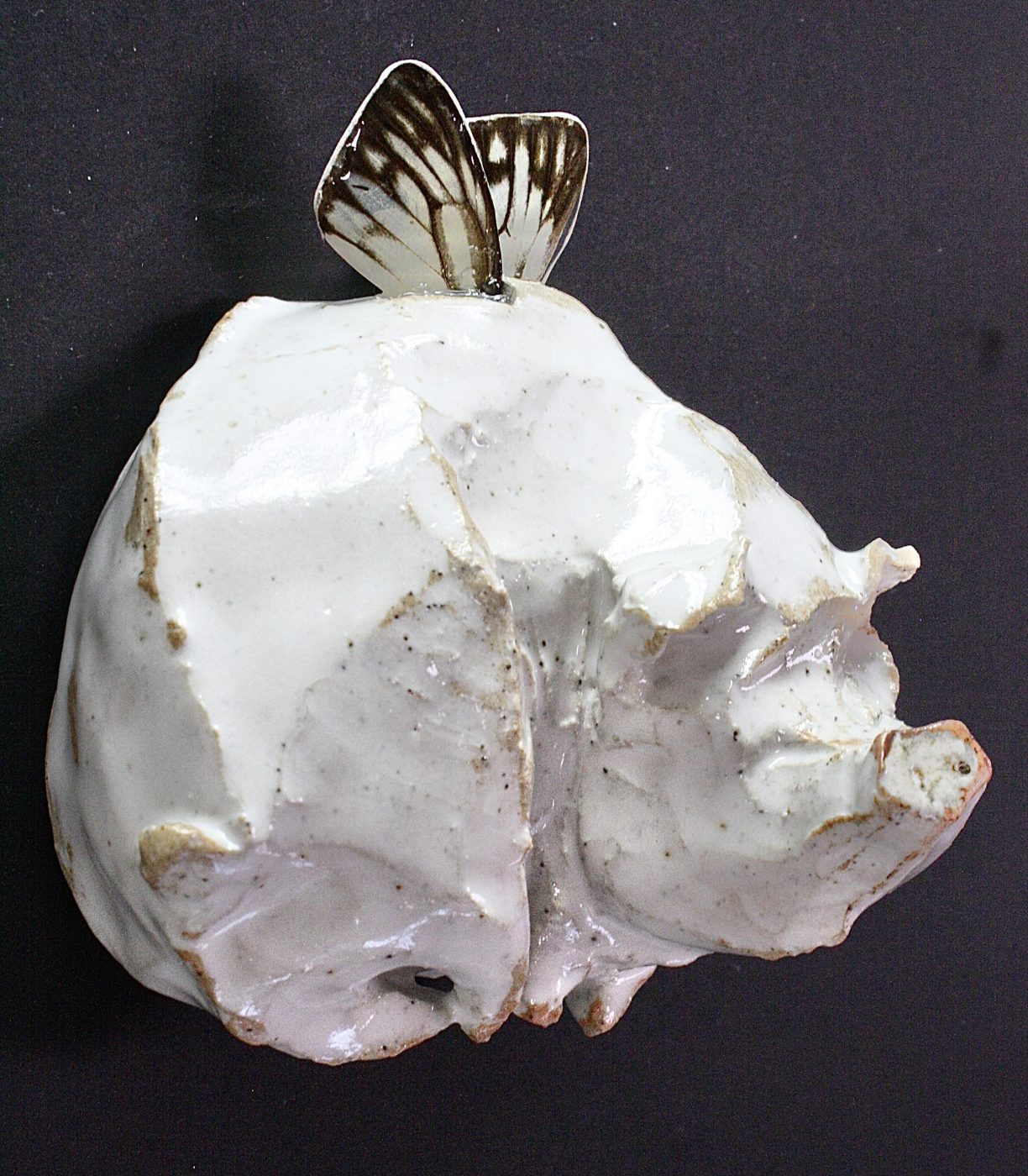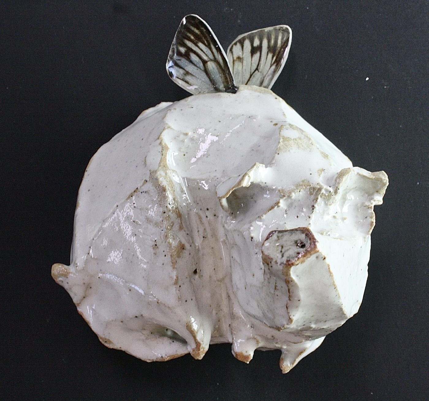 Ceramic wall-hanging sculpture; high fired clay, butterfly wings, resin
